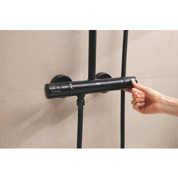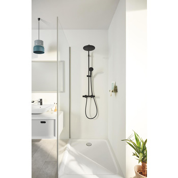 Душова система складається з великого верхнього душу на кульовому шарнірі (кут нахилу ±10°), потужної ручної лійки Vitalio Start 110 із двома режимами (м'який Rain і енергійний Jet) та настінного термостату. Висоту ручного душу дуже просто налаштовувати завдяки гнучкому фіксатору, а гладкий 1750 мм шланг VitalioFlex з технологіями AntiFold і TwistStop робить користування неймовірно зручним.
