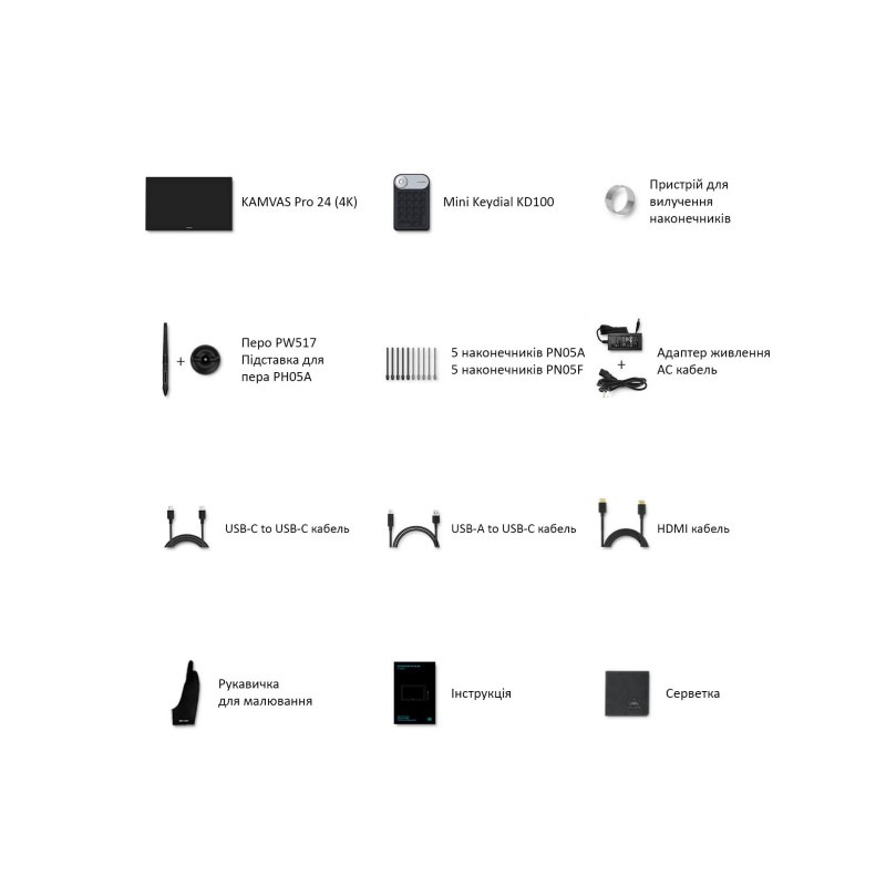 - Кабель USB-C, USB-A — Type-C, HDMI, блок живлення