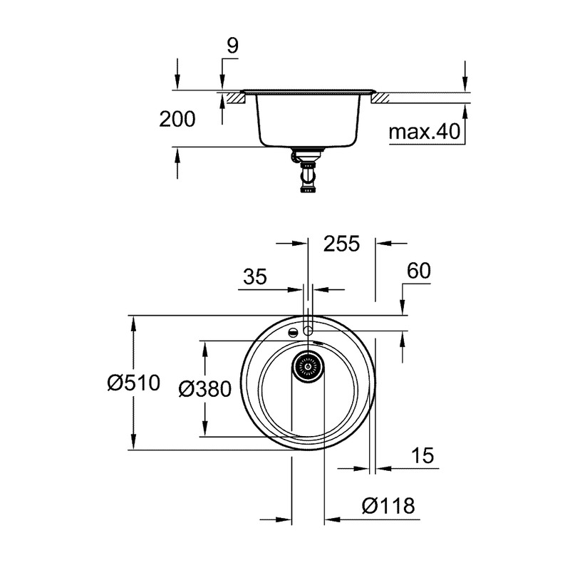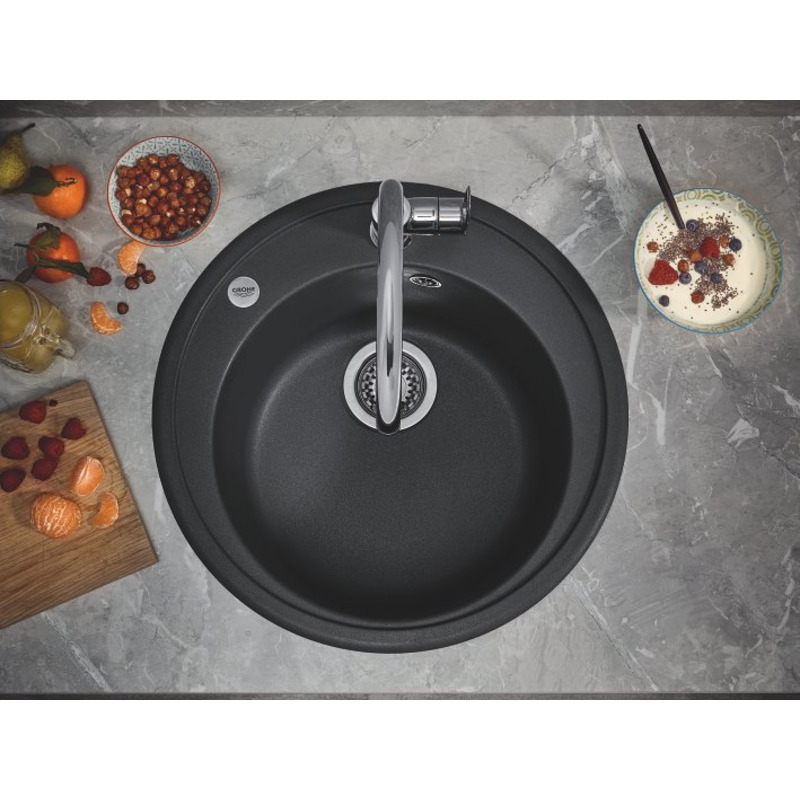 Grohe K200 – це, без перебільшення, еталонна кухонна мийка із кварцовим композитом у чорному гранітному кольорі. Уявіть – сучасна кругла форма (Ø 510 мм), врізний монтаж, одна функціональна глибока чаша (Ø 380 мм, глибина 200 мм), а ще – потужна технологічна основа для зручності без компромісів. Вже заінтриговані?