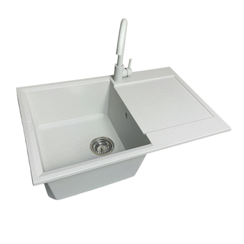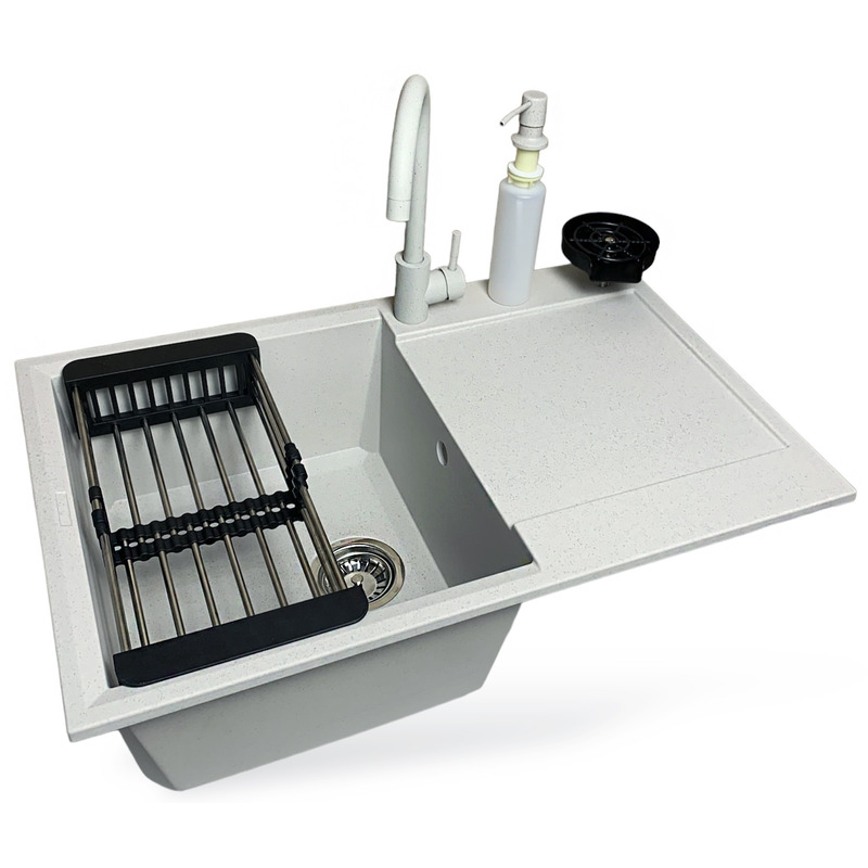 Ключовим елементом набору є велика врізна мийка зі штучного каменю Solid Surface. Вона має прямокутну форму та містку чашу (388 x 430 x 230 мм), куди можна занурити навіть габаритні каструлі або декілька тарілок одразу. Спробуйте уявити ранкові ритуали: всі кухонні справи – в одному просторі, усе під рукою й без зайвого клопоту.