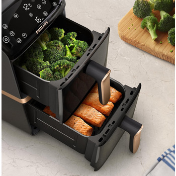 Philips Stacked Dual оснащена потужністю 2300 Вт та сучасною технологією RapidAir. Гаряче повітря рівномірно циркулює навколо продуктів, створюючи золотисту, апетитну скоринку. І все це — практично без олії! Насолоджуйтеся улюбленими хрусткими стравами — від картоплі фрі до курячих крилець — при цьому стежте за здоров’ям своєї родини.