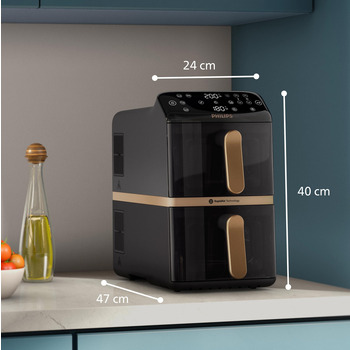 Philips Stacked Dual розроблена так, щоб займати на 45% менше місця на кухні порівняно зі звичайними аерофритюрницями подібної місткості. Витончений чорний корпус з пластика буде гармонійно виглядати в будь-якому інтер’єрі. Антиковзкі ніжки та теплоізольована ручка роблять пристрій абсолютно безпечним як для дорослих, так і для дітей.