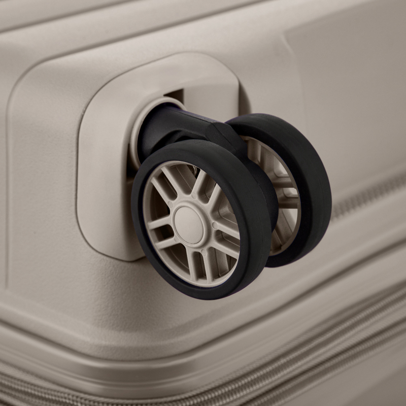 - Комфортне перевезення: завдяки чотирьом подвійним колесам із плавним рухом валізи легко маневруються навіть у переповнених аеропортах або на нерівних тротуарах міста.
