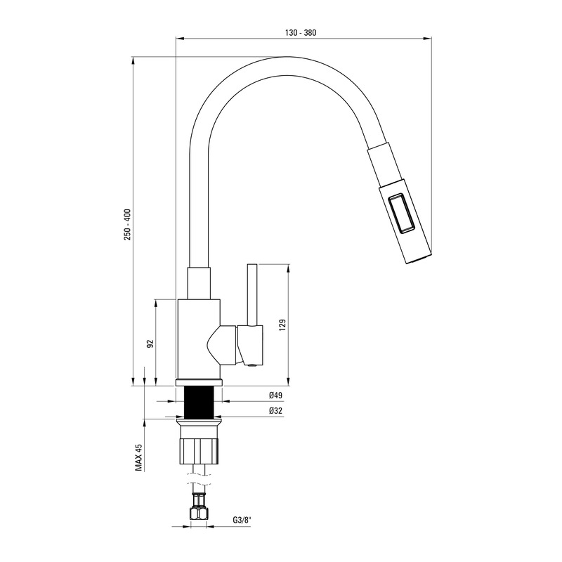 - Довжина підключальних шлангів: 350 мм, монтажна різьба 3/8'', з’єднувальна різьба M10