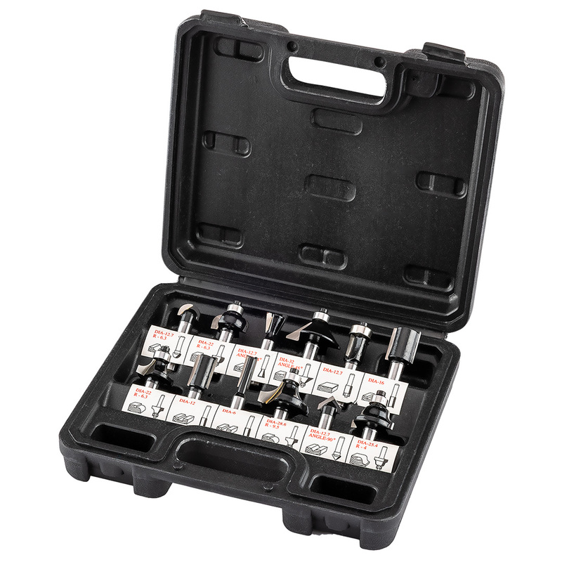 - Комплект із 12 різних насадок – дозволяє по-справжньому розширити ваші можливості в деревообробці. Кожна фреза продумана під різні типи робіт: від різьблення до вибірки пазів.