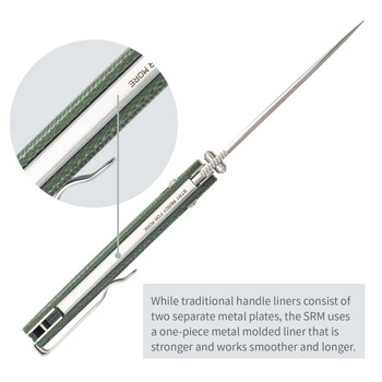 Уявіть: ви на природі, дощ застав вас зненацька, але ніж SRM Terrier миттєво відкривається навіть у рукавичках! Його сталь не боїться вологості, а у руці він сидить як влитий завдяки текстурі мікарти. Вам захотілося перекласти кліпсу під іншу руку — й це можна зробити без викрутки чи інших інструментів, швидко та легко.