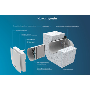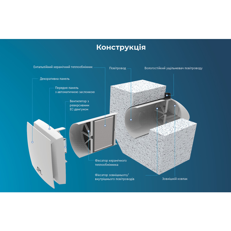 В основі пристрою — керамічний теплообмінник та потужний вентилятор, які забезпечують двосторонній повітрообмін. Коли повітря виводиться з приміщення, тепло з нього захоплюється керамікою. Далі у зворотному напрямку в кімнату надходить свіже повітря, яке під час проходження через вже нагрітий теплообмінник отримує тепло взимку або прохолоду влітку. Це не тільки комфортно, але й надзвичайно економно!