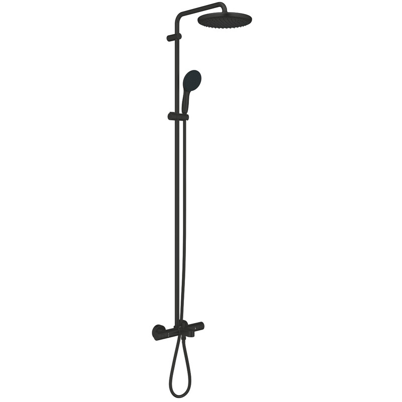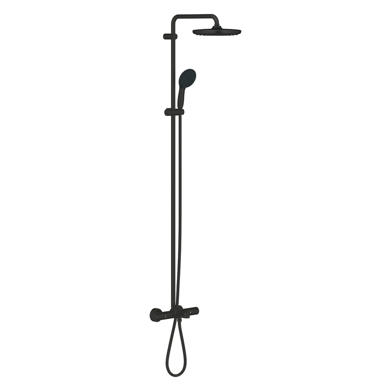 Представьте себе: вы пришли домой после долгого дня, а в ванной вас уже ждет душевая система Grohe QuickFix Vitalio Start System 250. Она сочетает в себе все, о чем вы мечтали: эффектный круглый верхний душ диаметром 250 мм, удобную ручную лейку с двумя режимами, а также точный термостат, который всегда держит температуру под контролем. Черный цвет подчеркивает современный стиль и элегантность вашей ванной комнаты. Звучит заманчиво, не так ли?