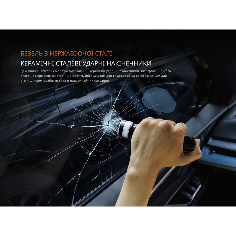 Корпус выполнен из антикоррозийного алюминиевого сплава A6061-T6. Стальной безель с керамическими наконечниками пригодится для разбивания стекла при чрезвычайной ситуации. Фонарь выдерживает падение с 1 метра, полностью защищен по стандарту IP68 — не боится воды и пыли.