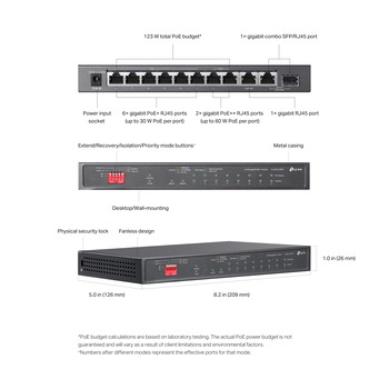 - Количество портов: 10 (9 x RJ45, 1 x SFP/RJ45 комбо)