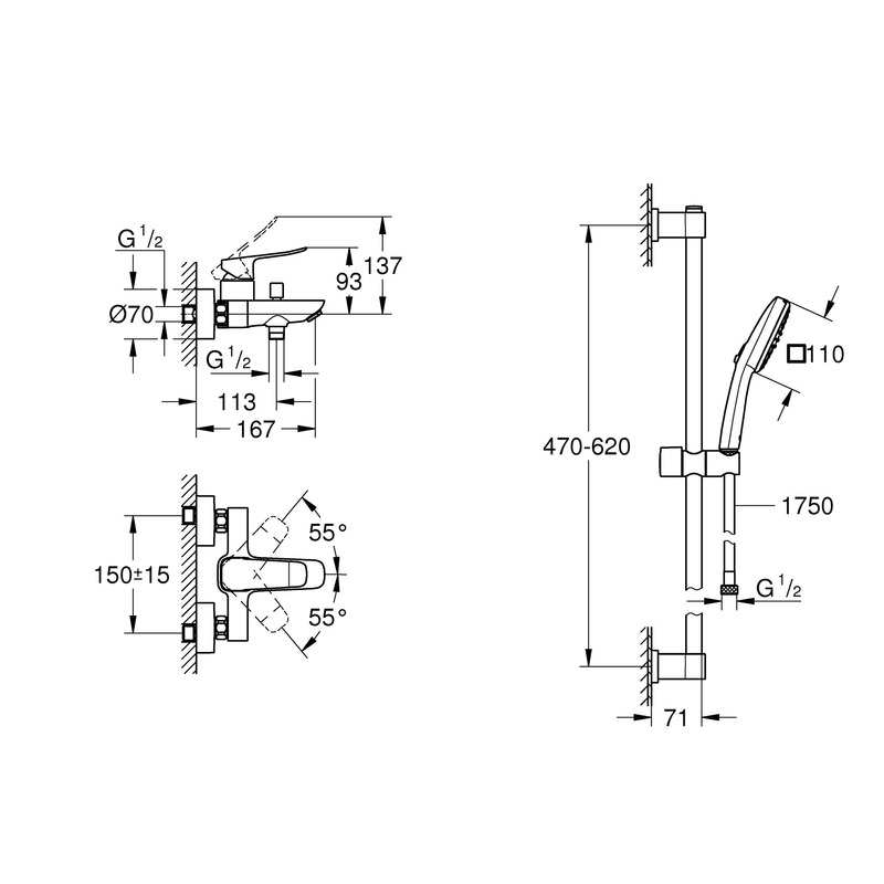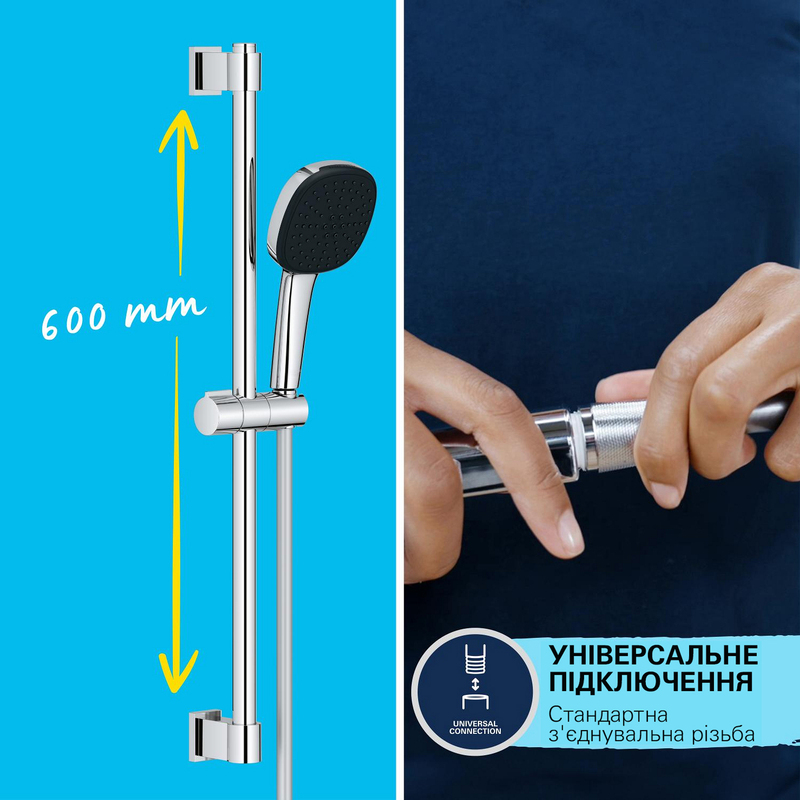 - Душевой комплект Vitalio Comfort 110 — ручной душ с тремя режимами (дождевой, гидромассажный, струйный), стойка длиной 600 мм, удобный держатель, хромированное покрытие, шланг из нержавеющей стали и PVC (1500 мм).