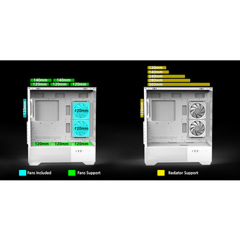 В комплекте вы получаете три ARGB вентилятора 120 мм: два реверсивных сбоку и один сзади, подключённых к контроллеру. Яркая многоцветная подсветка с эффектом бесконечного пространства придаёт компьютеру особый шарм. Красиво? Беспорно. Эффективно? Ещё как!