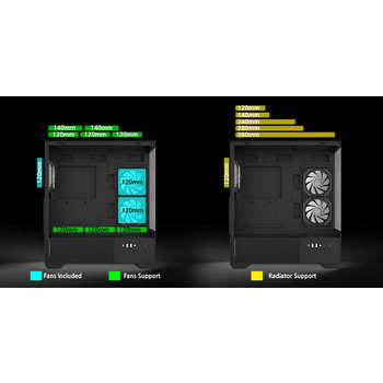 - Поддержка до 8–9 вентиляторов (верх, низ, бок, зад), а также СЖО: установка как одно-, так и многосекционных радиаторов (120–360 мм).