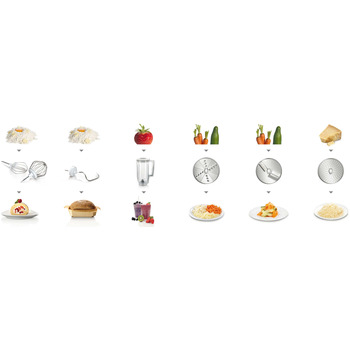 - 8 насадок в комплекте: венчики для взбивания, блендер, терка/шинковка с тремя дисками, крюк для замеса теста — всё для универсальности!