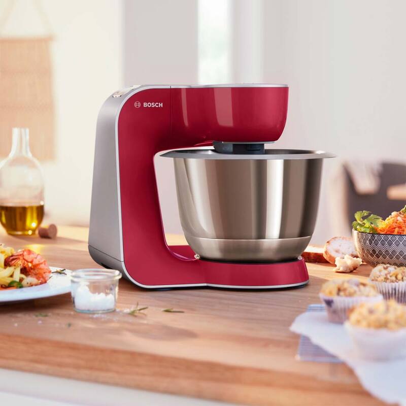 Красный цвет корпуса из ударопрочного пластика делает кухонную машину Bosch заметной украшением кухни — ярко и стильно! Весит устройство всего 6,4 кг, размеры 28 × 28.2 × 27.1 см и удобная система хранения кабеля и насадок экономят пространство. Перемещение устройства по столешнице абсолютно безопасно благодаря прорезиненным ножкам.