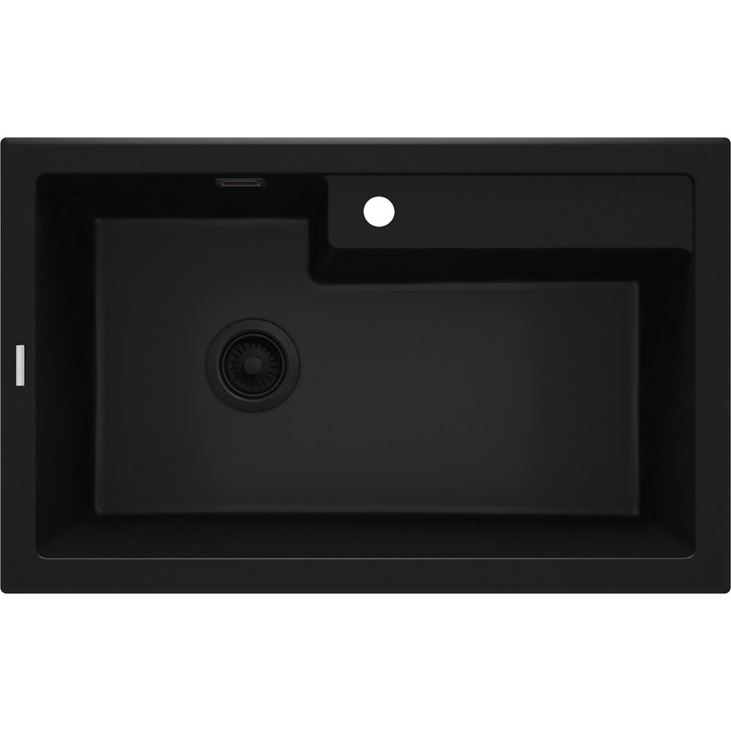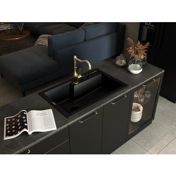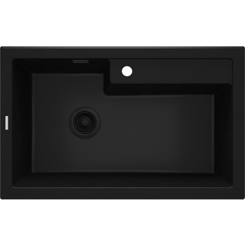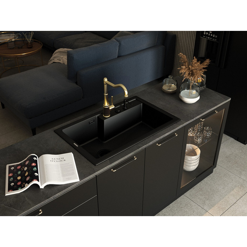 Черный цвет, прямоугольная форма и лаконичный стиль гармонично смотрятся как на классической кухне, так и в современном пространстве. За счет двух фрезерованных отверстий вы без проблем разместите смеситель и дозатор мыла, а автоматический клапан Click добавляет комфорта в управление сливом одним движением.