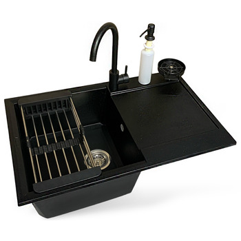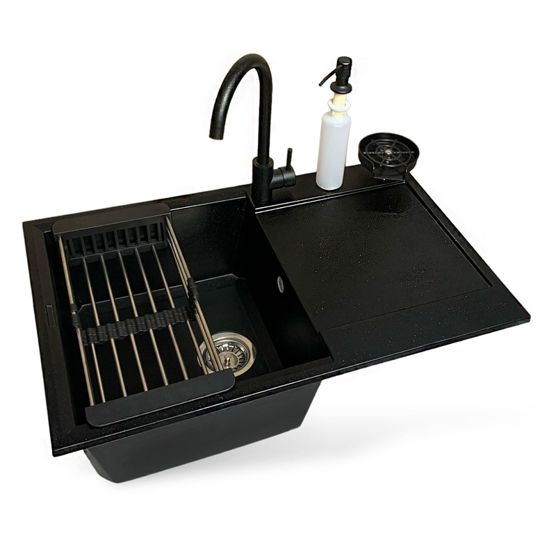 Стильный черный цвет впишется как в современные, так и классические кухни. Прямоугольная форма мойки подчёркивает актуальный стиль. Крыло служит рабочей зоной для сушки, а дополнительные аксессуары (коландер, дозатор и ополаскиватель) делают уход за посудой более приятным и простым.