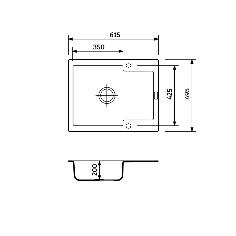 - Врезная прямоугольная мойка: Монтаж с нижним креплением, размеры: 615 x 495 x 200 мм.
