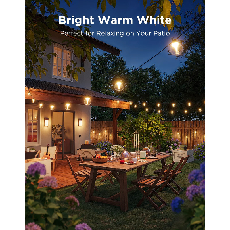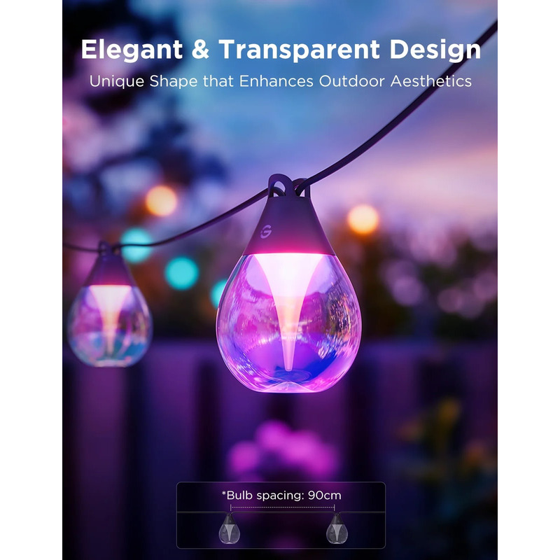Представьте себе уютный вечер на собственной террасе или шумную вечеринку во дворе... Набор светодиодных ламп Govee H7025 поможет создать нужное настроение! Яркие плавные переходы цветов, которыми вы легко управляете прямо с телефона или с помощью голоса – это новое слово в уличном освещении. Прочный черный кабель и прозрачные лампы из поликарбоната практичны, а дизайн отлично вписывается в любой экстерьер: днем гость почти незаметен, ночью превращается в световое представление.