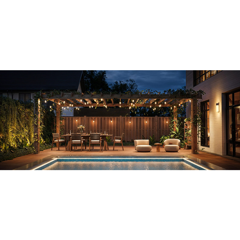- Теплый белый свет: добавляет уюта семейным ужинам, праздникам на воздухе или романтическим трапезам.