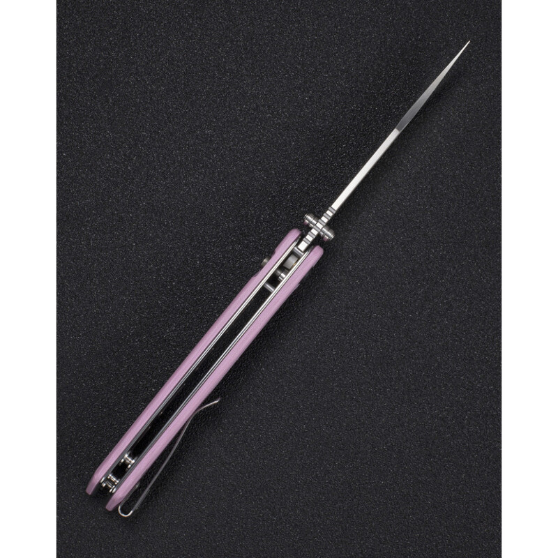Накладки из G10 на рукояти (розового цвета) обеспечивают приятный хват и устойчивость в любой ситуации — будь то дождь, жара или влажные условия. Этот материал не впитывает воду, не скользит и отлично подходит для активного использования. Форма и текстура продуманы так, чтобы нож комфортно лежал даже в маленькой ладони, а рука не устает.