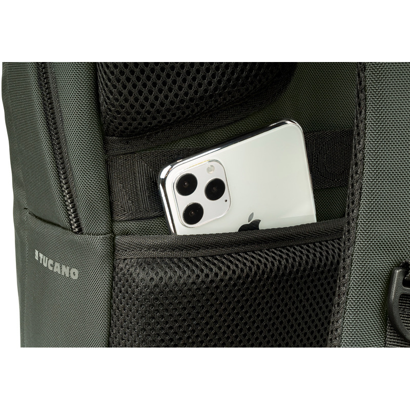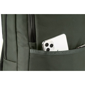 Изготовлен из плотного нейлона 600 ден, этот рюкзак выдержит испытание частыми поездками и активной жизнью. Модный цвет хаки отлично сочетается с деловым и повседневным стилем, а фирменный рисунок с надписью TUCANO на переднем кармане и ремне-фиксаторе добавляет особого шарма.