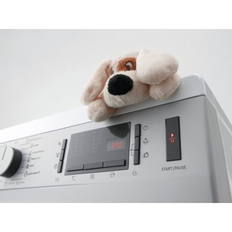 Эргономичный дисплей, сенсор контроля уровня воды, удобная регулировка отжима, выдвижной дозатор — всё продумано до деталей. Есть защита от детей, так что можно не беспокоиться за малышей, которым всё интересно.