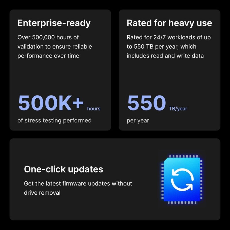 Форм-фактор 3.5" специально ориентирован на серверы и корпоративные NAS-решения. Прочная конструкция корпуса минимизирует вибрации, продлевая срок службы. Энергоэффективная электроника означает экономию электроэнергии: 8,1 Вт при работе и только 4,3 Вт в режиме ожидания. Меньше перегрева, меньше рисков для вашего оборудования.