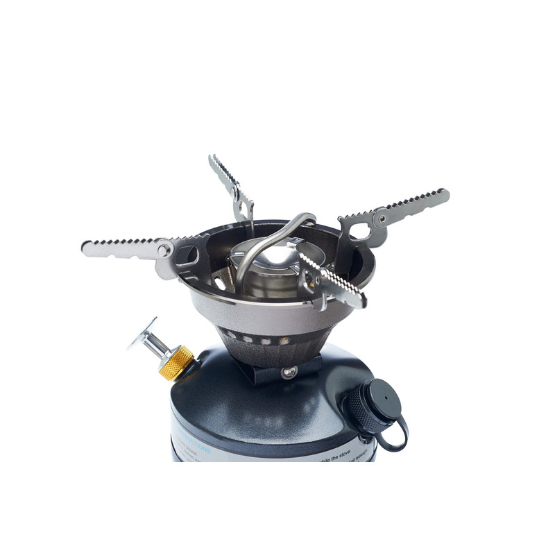 Корпус примуса выполнен из сплава магния и алюминия, что обеспечивает минимальный вес без потери прочности. Внутренние элементы из нержавеющей и коррозионностойкой стали дополнены медными соединениями для надежного теплообмена. Защита от ветра гарантирует стабильное пламя даже при сильном порывистом ветре.