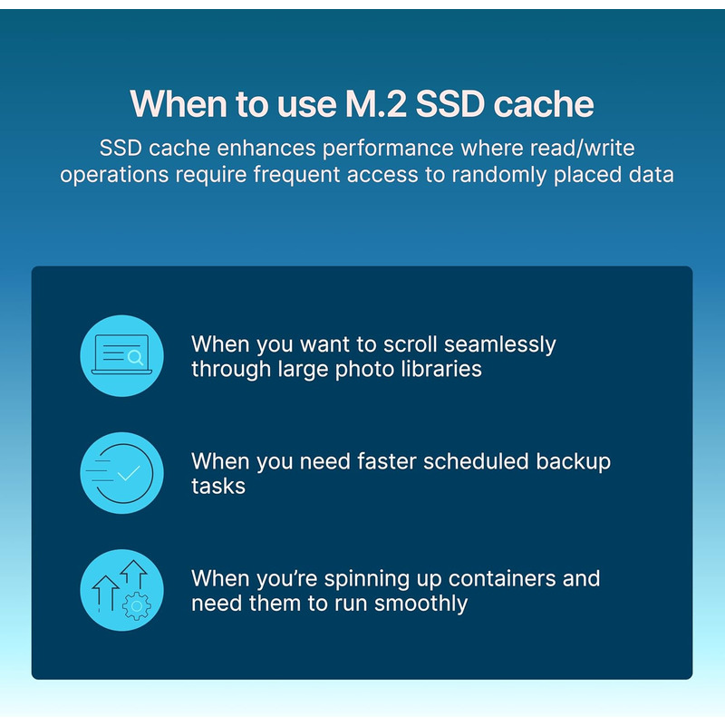 Уявіть собі: запускаєте улюблену гру без очікування, швидко копіюєте гігабайти даних або монтуєте відео, не відволікаючись на повільну швидкість — усе це стає реальністю з SSD Synology. Після переходу на цей накопичувач – порівнюватися зі старими рішеннями просто неможливо!